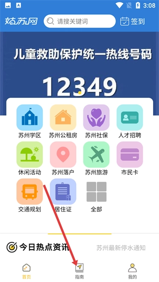 1、进入姑苏网首页后,点击底部的【指南】按钮,就能进入生活指南页面,从而获取各类生活服务的分类入口。