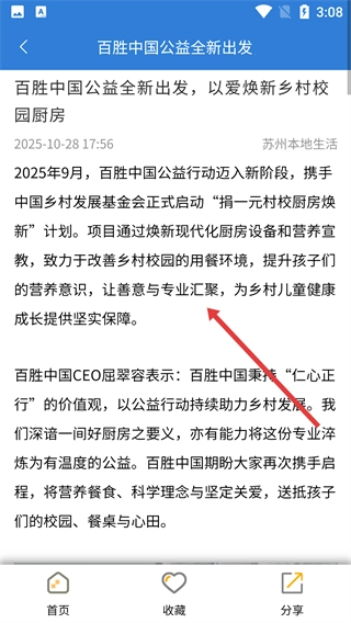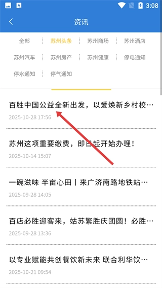 3、在【苏州头条】的资讯列表里,找到你感兴趣的新闻条目并点击,例如【百胜中国公益全新出发-以爱焕新乡村校…】,就能进入该新闻的详情页面。