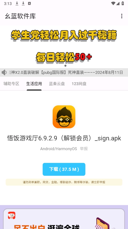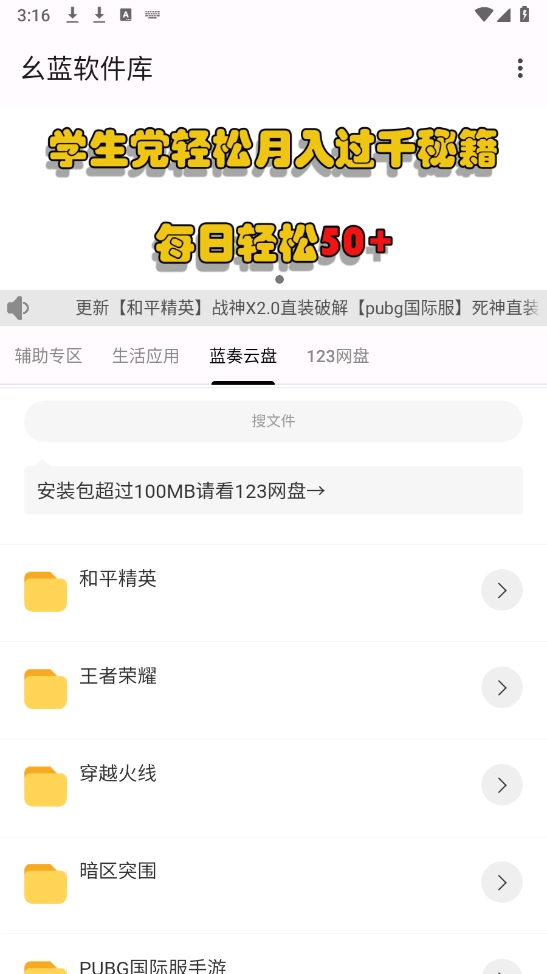 进入首页后,可以看到众多分类,包括辅助专区、生活应用以及蓝奏云盘等。