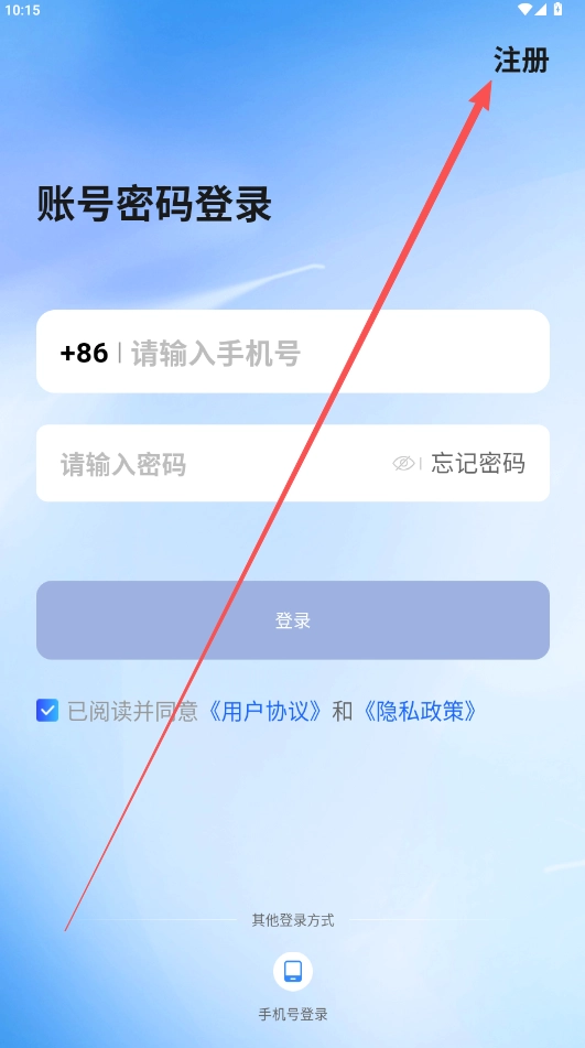 2、输入使用者号码,勾选下方的用户协议和隐私政策后点击“注册”。