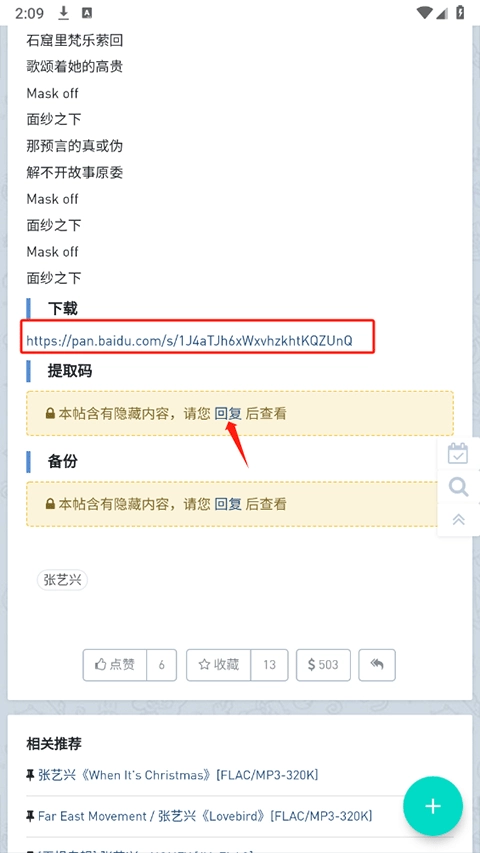 4、进入页面后,将页面下拉至底部,即可看到歌曲的网盘链接,提取码处于隐藏状态,需在评论区回复内容才能显示,点击回复按钮即可操作。