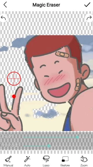 4、用手指涂抹或点击想要保留的主体(比如人物),软件就会自动识别边缘并把背景抠掉。