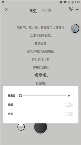 诗音是一款集多种功能于一体的文章阅读工具,在这里你能接触到海量其他用户创作的原创文章,这些内容能为你的创作提供丰富的灵感来源。它还配备了十分贴心的智能朗读功能,无需逐字逐句阅读,使用起来极为便捷;同时,你可以为自己的文章搭配个性化图片,以此提升文章的感染力。当你完成文章创作后,软件还能朗读你的作品,让你可以闭上眼睛,沉浸式地聆听自己的文字。
