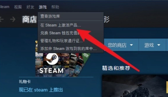 2.在Steam客户端的左上角,点击相应选项,然后从弹出的下拉菜单里选择“在Steam上激活产品”。