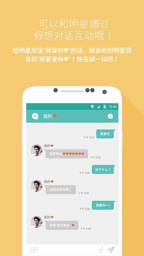 要是给你喜欢的明星发送“在干什么?”这句话,在Mydol的假想对话里就能收到“在想你!”这样的回复呢!
