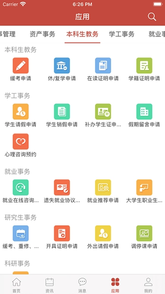 3、为学生提供请假申请、选课申请等便捷的事务申请功能,省去了繁琐的线下手续,提升了办理效率。