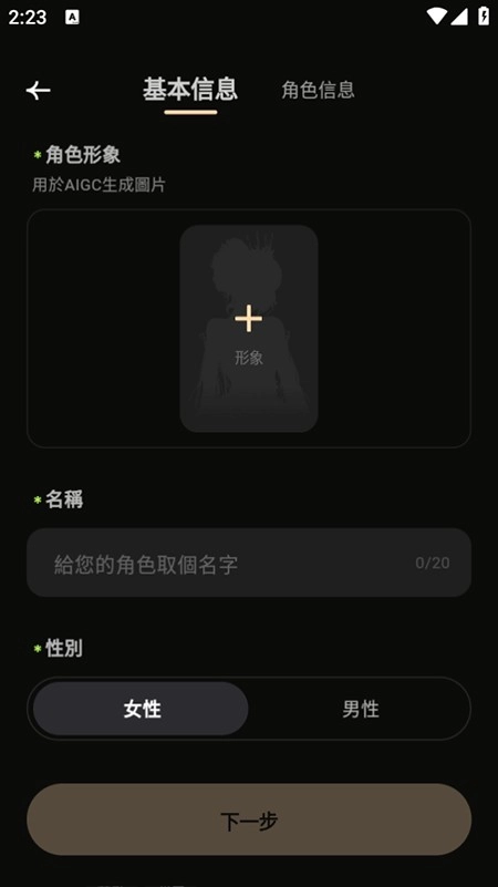 3、进入“创建独特的角色”板块,设置角色的性别、外观、性格、背景等信息,完成设定后,即可与自创角色进行互动。
