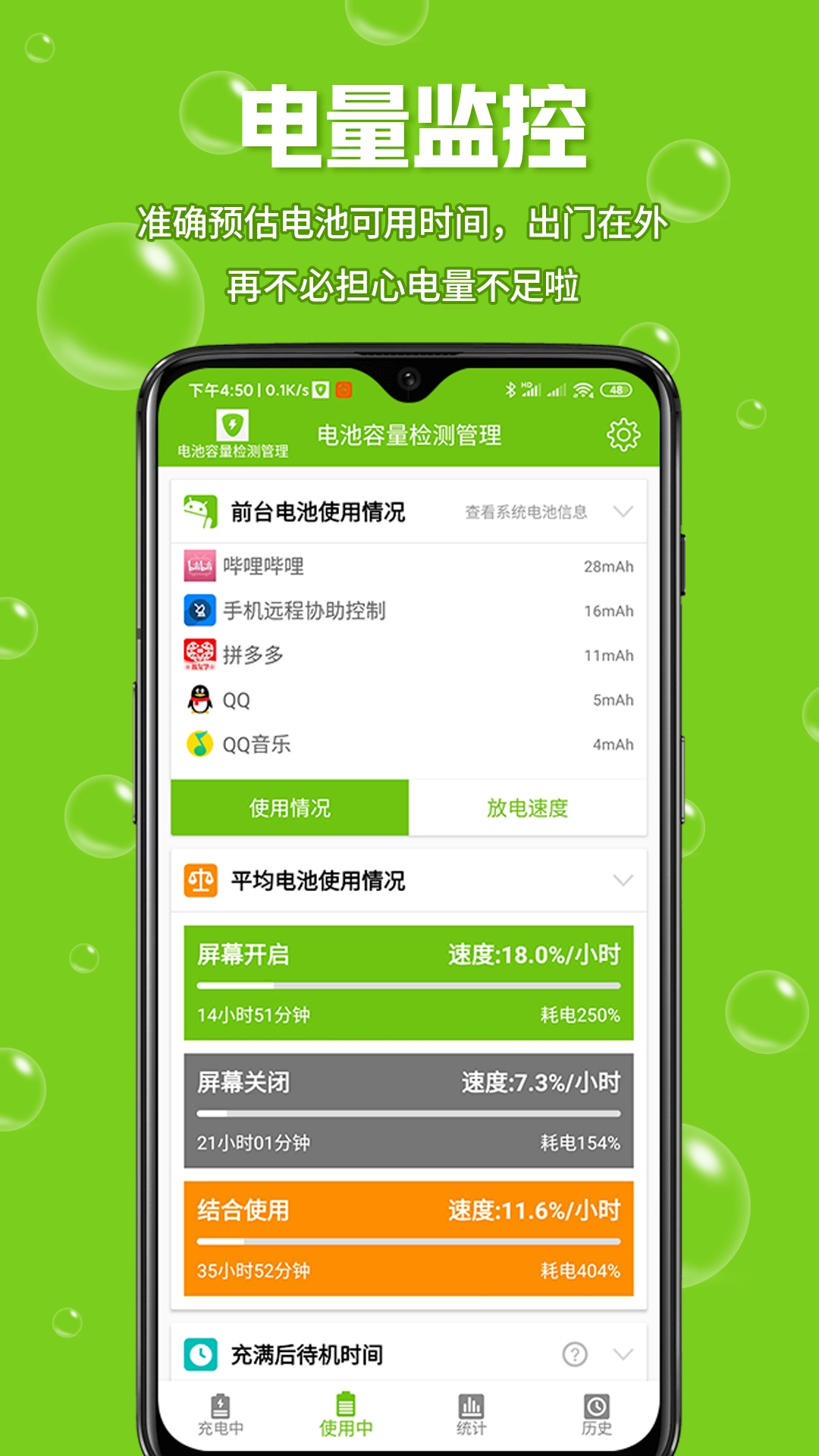 3、电量监控:可以预测剩余电量的使用时长,还能给出各项功能单独使用时的预估时间,精准判断电池还能支撑多久,让您外出时不再为电量不够而担忧。