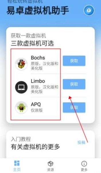 1、打开易卓虚拟机助手,进入后找到首页展示的三款虚拟机,从中任意选择一款并点击获取。