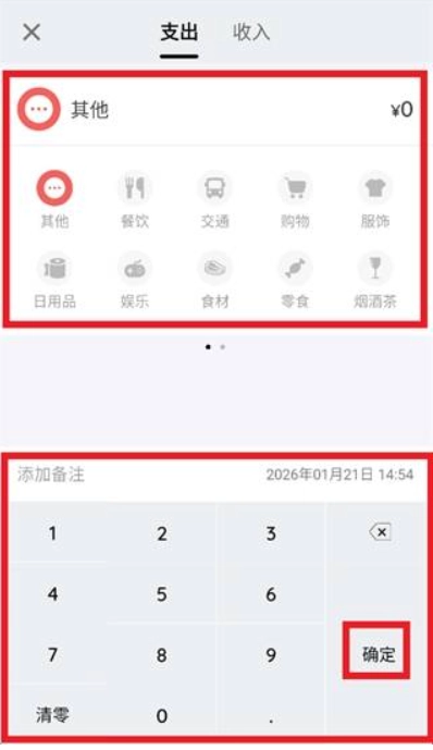 2、进入后,在支出板块选择用途,输入金额、备注等信息,点击确定按钮即可完成操作。