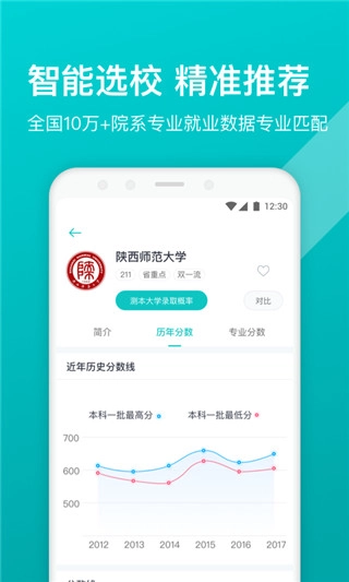 查看院校详情时,可以了解学校的简介、历年分数线以及各专业的分数线。