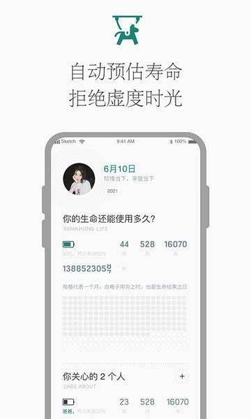 4、【主题风格】系统界面设计简洁美观,展示风格直观大方,能清晰呈现自己与他人的生命进度,以此提醒人们珍惜时间。