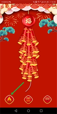 1、打开电子鞭炮应用,进入主页面后,点击页面底部左侧那个形似火堆的图标(就是下图绿色箭头所指的区域,点击后就能鸣放电子鞭炮啦)
