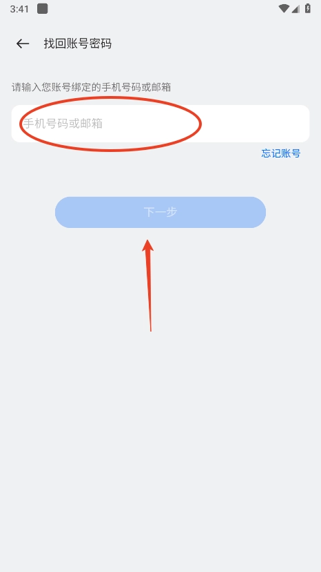 输入注册时号码或邮箱,点击“下一步”;