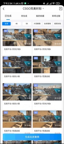 你可以在待生成板块里找到自己想要生成的高光时刻,另外,完美世界电竞作为CSGO的对战平台,大家在游戏竞技过程中的高光表现同样也能生成。