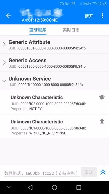 4、连接后,树形结构会列出所有服务、特征的uuid以及特征属性,能便捷地对特征执行读写、开启或关闭通知、设置mtu等操作。