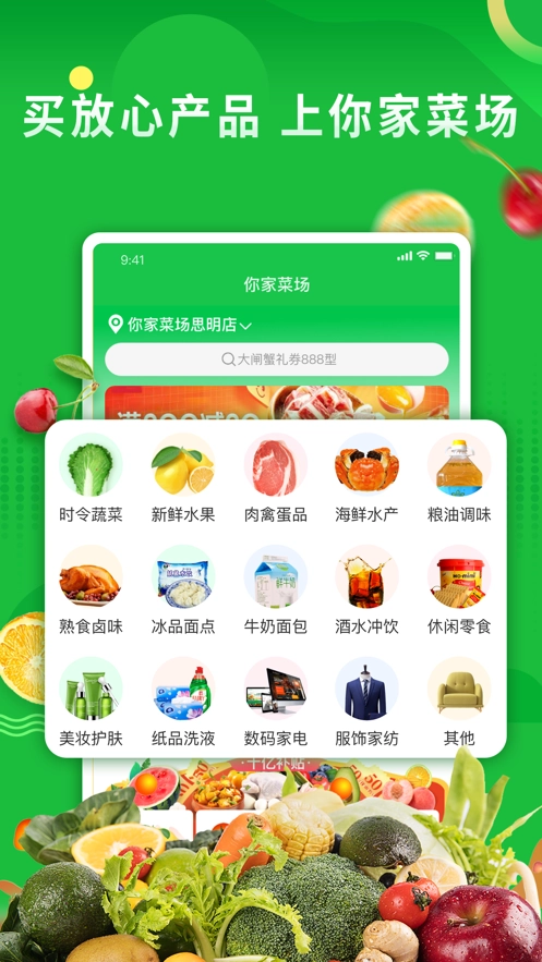 时令蔬菜、新鲜水果、肉禽蛋品、海鲜水产、粮油调料、熟食卤味、冻品糕点、牛奶面包、酒水冲饮、休闲零食、美妆护肤、清洁用品、数码家电、服装纺织等。