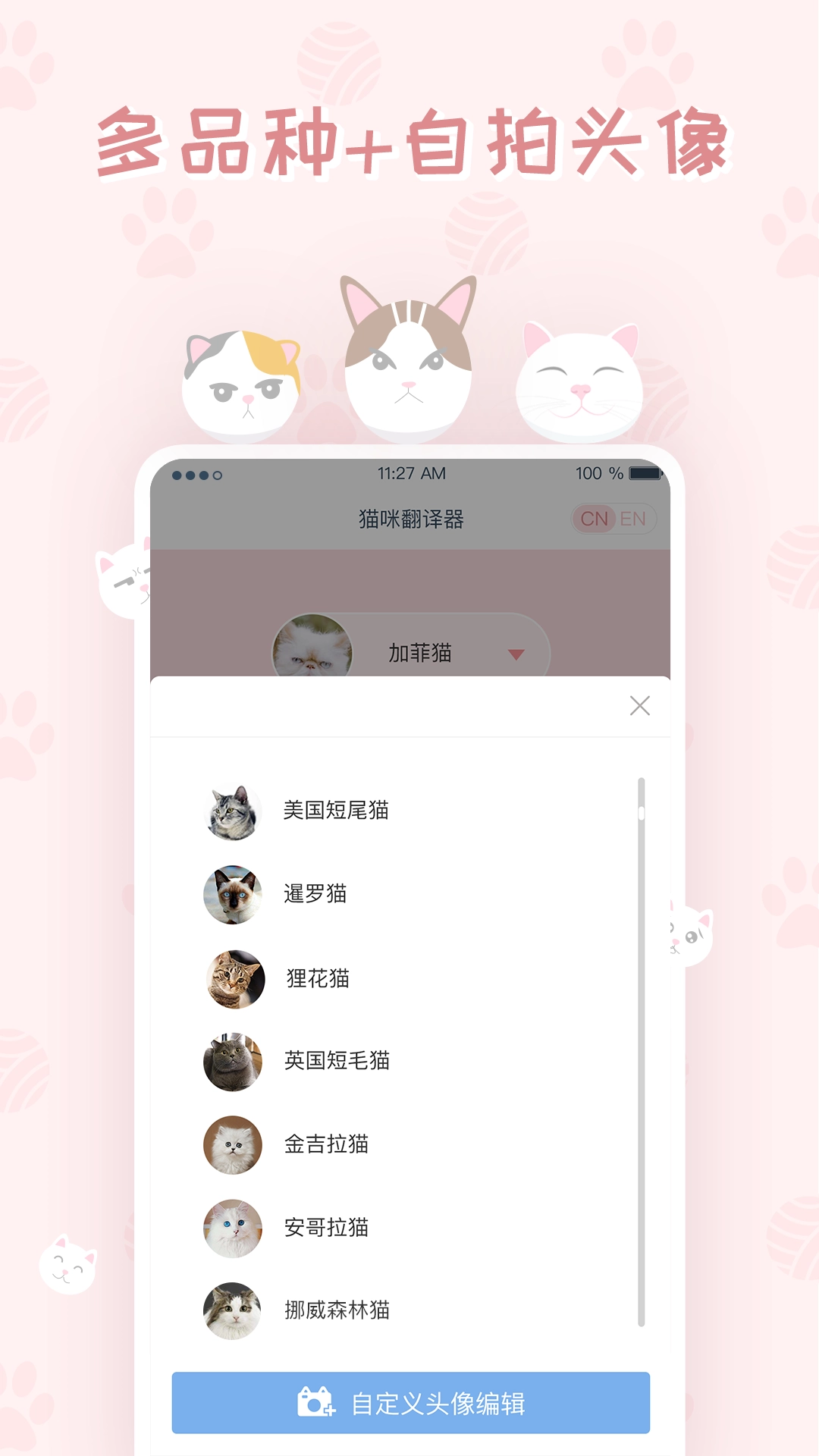 支持所有猫咪品种的语言翻译功能,还提供多种类型的声音供选择,像波斯猫、布偶猫、狸花猫、美国短毛猫、英国短毛猫、金吉拉猫、安哥拉猫、挪威森林猫等都包含在内。