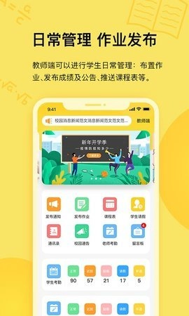 2、教师端具备学生日常管理功能,可开展布置作业、发布成绩与公告、推送课程表等操作。