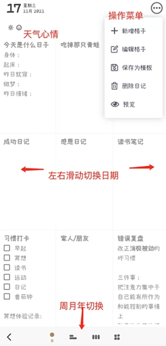 1.创新的九宫格记录形式,使日记填写更具结构性与满足感