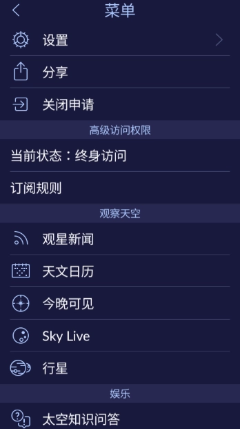 4、打开菜单栏就能看到更多有意思的功能啦,像观星新闻、天文日历、今晚可见之类的都在里面。