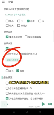 3、进入“设置”页面后,找到“音乐来源”板块下的“自定义源管理”选项