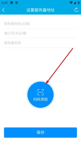 3、进入服务器地址设置页面后,你可以填写服务器地址、端口号和服务名称,也能通过点击【扫码添加】来快速获取服务器信息,所有信息填写或获取完毕后,点击保存即可。