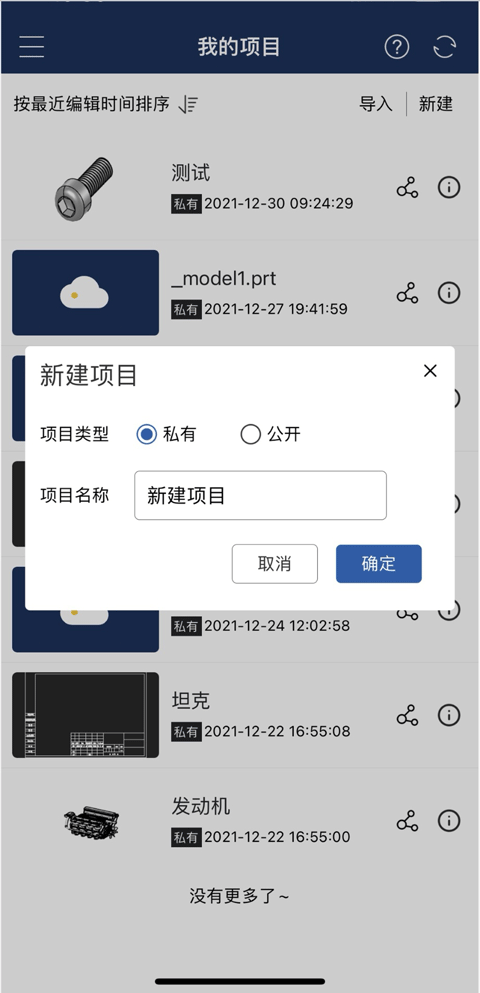 3、新建操作:点击界面上的“新建”按钮后,底部会弹出新建选项菜单,从中可选择创建新项目或新文件夹。若选择新建项目,还能进一步将项目类型设置为私有或公开;并且在新建项目的过程中,系统会默认自动生成一个空的零件文档和一个空的装配文档。