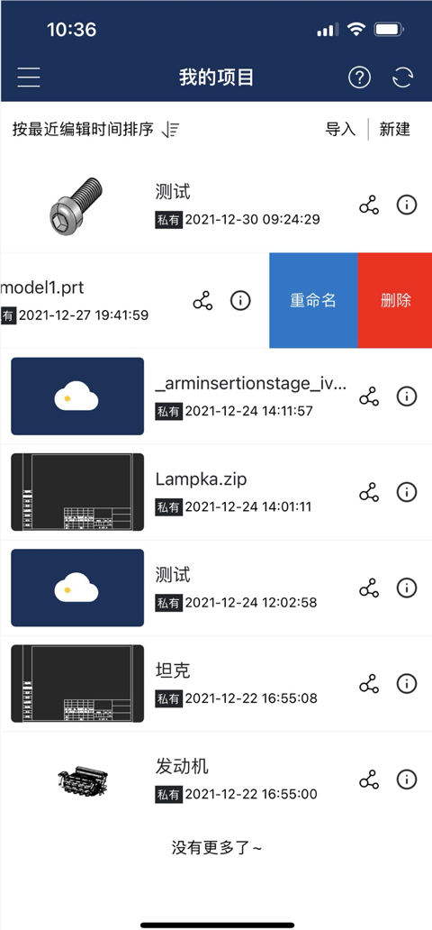 2、导入: 点击“导入”,显示当日可用的导入次数,在文件中选择支持的模型格式,选择后开始进行导入。支持的模型格式为:IGES、STEP、PTC、NX、CATIA、SolidWorks、ParaSolid、OBJ、STL、IFC、3DM、Revit、PDF、DWG。 (说明:在项目管理界面导入的文档自动创建一个项目,项目中显示导入的文档。)