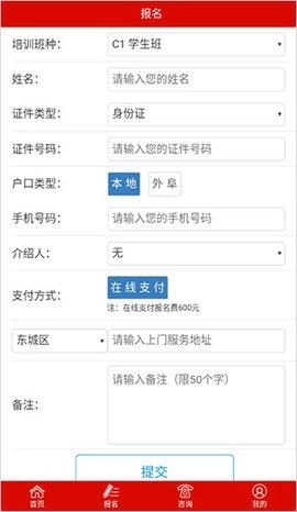 2、在报名页面填写相关信息完成驾考培训报名。