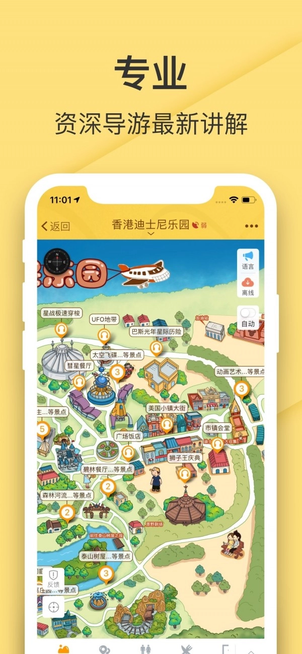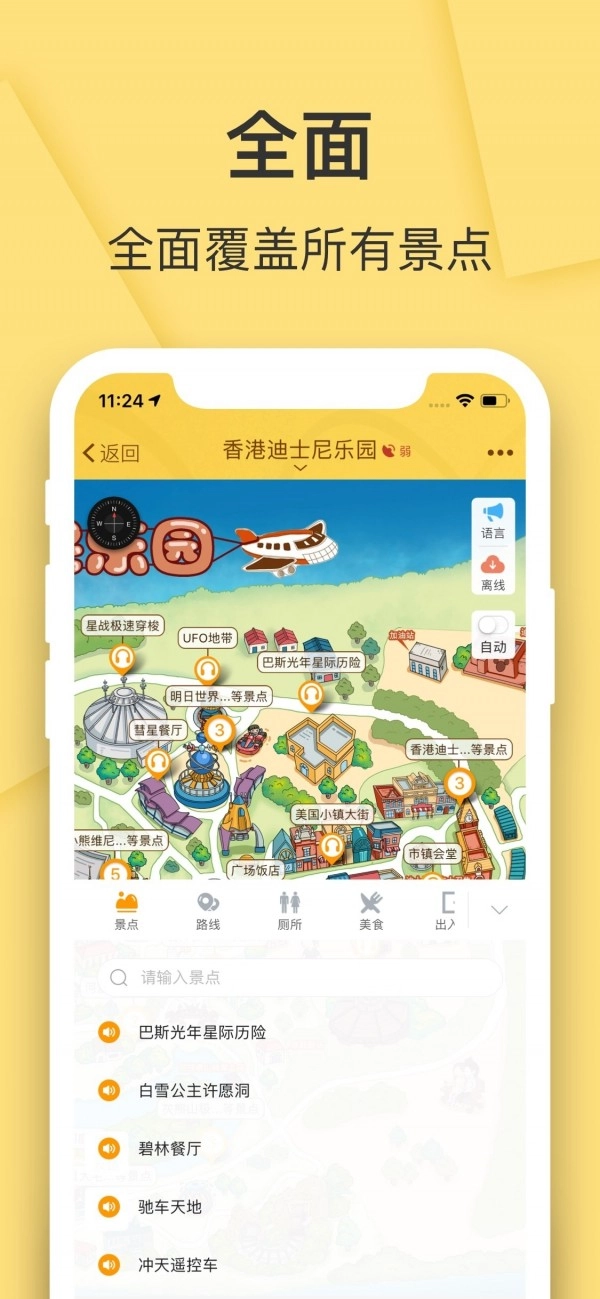 2、便捷导航:乐园地图配备GPS定位功能,能帮助您快速定位自己在乐园内的具体位置,同时轻松查找周边的游乐项目、迪士尼朋友互动点、餐饮场所和购物商店等。