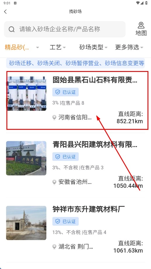 3、筛选完成后,点击你感兴趣的砂场企业条目,例如【固始县黑石山石料有限责任公司-企业名称】。