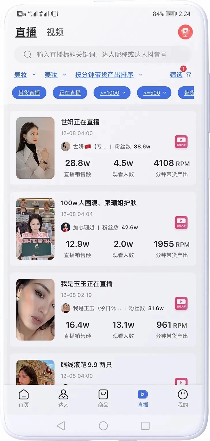 2、独家数据指标:提供独特的数据指标,可量化主播每分钟带货产出效率,助力用户精准识别优质主播与直播间。