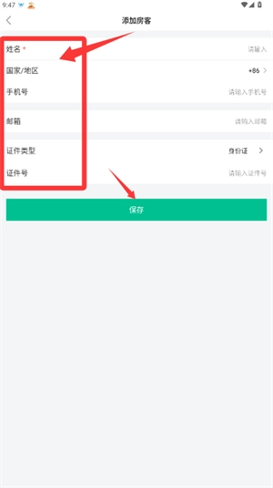 4、在新增页面填写房客姓名、联系方式等信息,点击保存按钮即可完成添加操作。