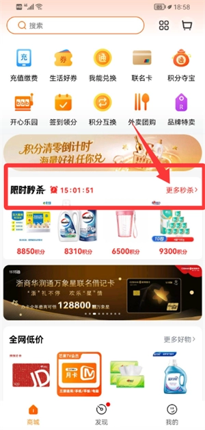 2、进入商城首页后,找到限时秒杀专区,点击查看更多活动商品。