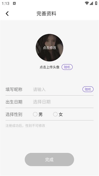 3、登录操作完成后,我们可以填写个人的昵称、出生日期以及性别信息,以此完成注册流程。