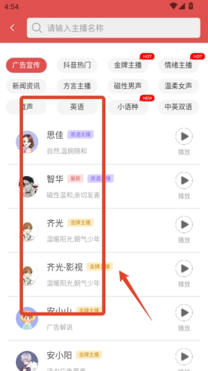 2、挑选你偏好的主播声音风格,像轻柔女声、沉稳男声或是萌趣童音,先试听一下看看效果是否符合预期。