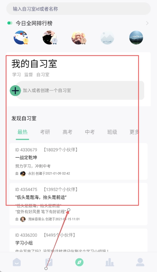 3、平台设有自习室社交功能,用户能够加入自己感兴趣的学习小组,和优秀的伙伴一起专注学习,还可以比拼专注时长。