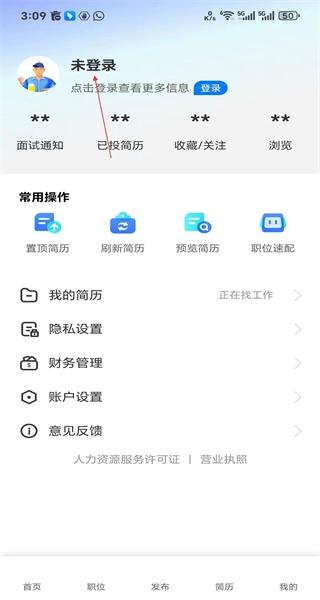 打开软件后,用户能够浏览招聘信息,点击“我的”选项即可进入个人中心页面。