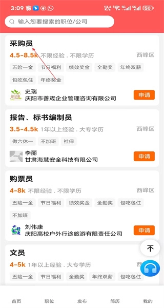 4、操作完成后回到职位页面,浏览各类招聘岗位,查看采购员等职位的薪资及福利情况。