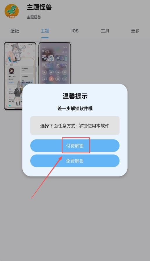 3、弹出温馨提示后,可通过选择付费解锁的方式来启用该主题,确认购买意向后即可进行后续的支付流程操作。