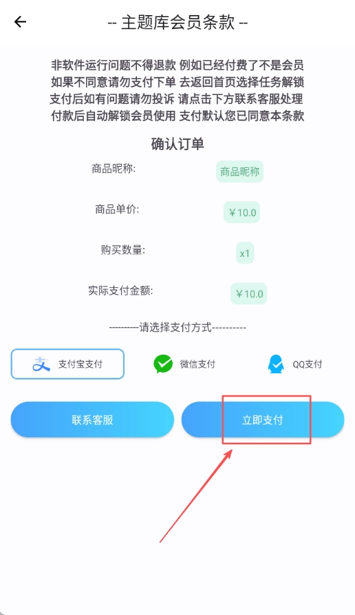 4、在主题库会员条款确认订单的界面,选择支付方式并点击“立即支付”,即可完成会员解锁,享受全部主题资源的使用权限。