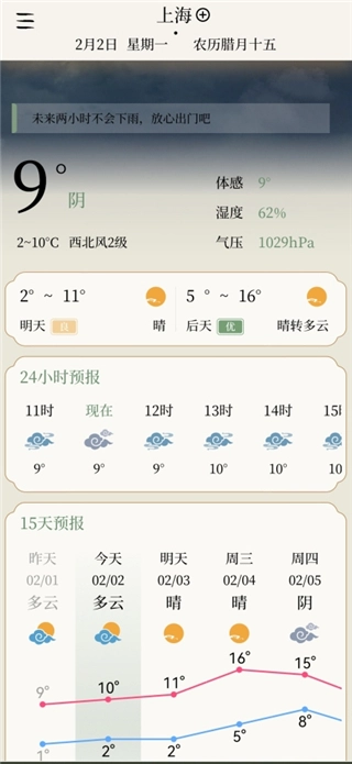 3、之后你就能看到该城市的24小时天气预报、15天预报以及其他天气相关信息。
