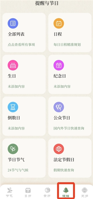 1、打开软件后,点击底部的【提醒】选项,这里包含添加日程、生日、倒数日等多种功能。