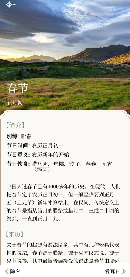 4、点击节日可以查看该节日的简介、来历等信息。