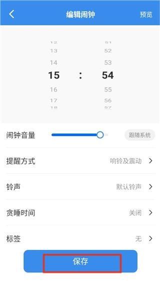 3、开启权限后,设置好闹钟的提醒方式、铃声和小睡时间,点击“保存”按钮,即可成功添加闹钟。
