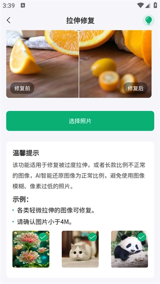 6、点击“拉伸修复”功能,此功能可用于修复被过度拉伸或长宽比例失调的图像,通过AI智能技术将图像还原至正常比例,建议避免使用图像模糊、像素过低的照片进行修复。