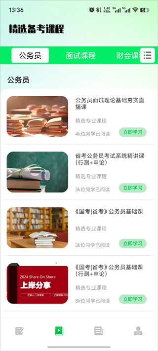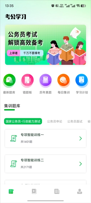 公务员之家设有丰富的学习功能板块,整合了题库练习、模拟考试、名师课程、学习计划等多种功能,用户能够依据自身的学习进度,针对薄弱环节开展专项练习,从而提高考试分数。