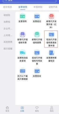 1、打开江苏税务应用,可通过【办税】板块下的【发票使用】入口进入【现场代开增值税普通发票】功能,也能直接在搜索栏输入功能名称快速进入。