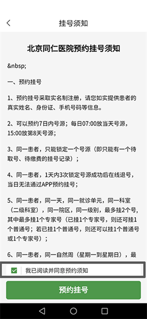 3、仔细阅读预约须知并确认理解相关要求后,勾选“我已阅读并同意预约须知”选项,然后点击“预约挂号”按钮。
